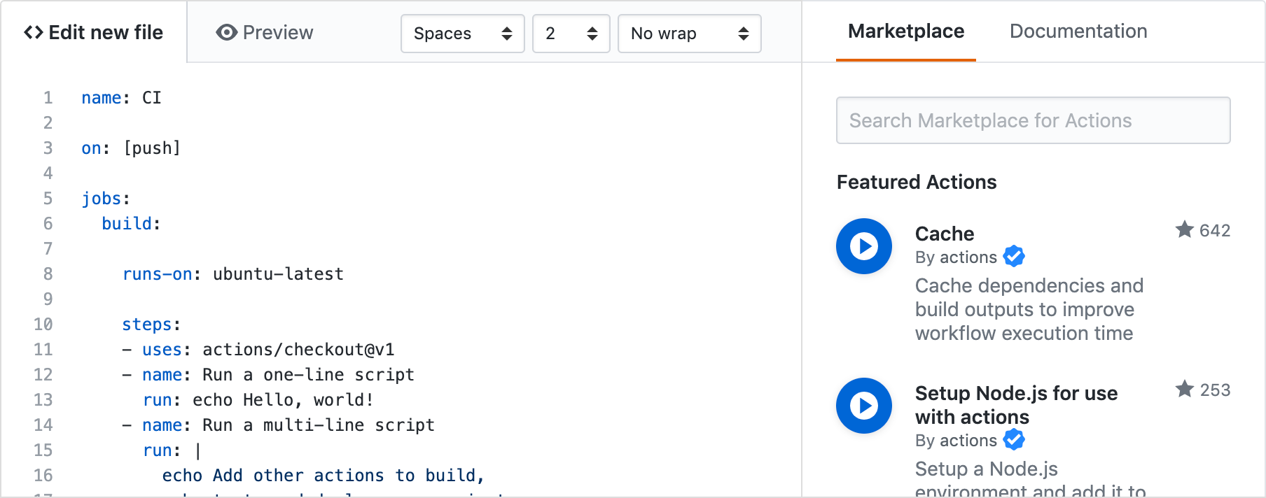 But we can do better than relying on a search engine. If we publish this action to the GitHub Marketplace, then people who want to build a workflow have a focused place to look for actions that they can use to extend GitHub. The marketplace will even show up in the workflow editor, so that people can find actions easily.